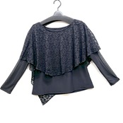 ストレッチ素材、シンプルな黒のトップスに大きめのレースケープを合わせたデザインです。