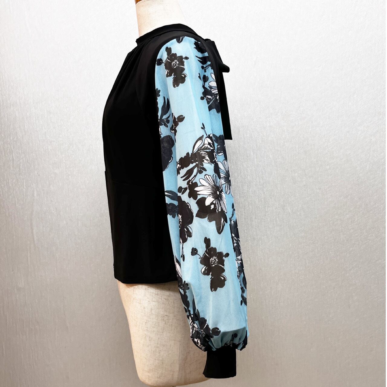 黒地に袖が可愛いパフスリーブのトップスです。後がリボンで結ぶタイプです。