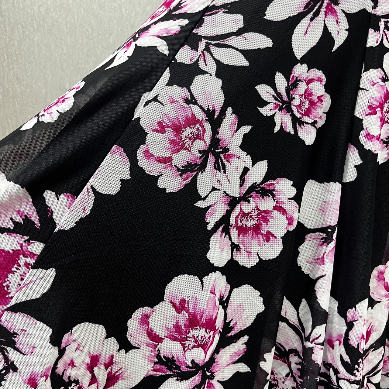 黒に白とピンクの花柄で、上品な中に華やかさをのぞかせます。ボディラインもスッキリ見せます。おすすめのセットアップです。
