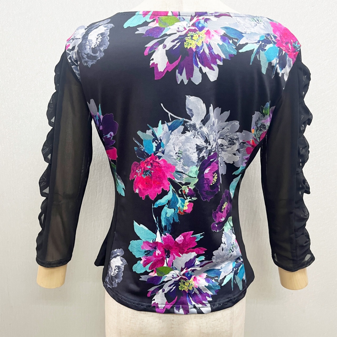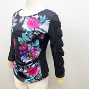 ツルッとした上質のストレッチ黒地にピンクとグリーンの花柄トップス。