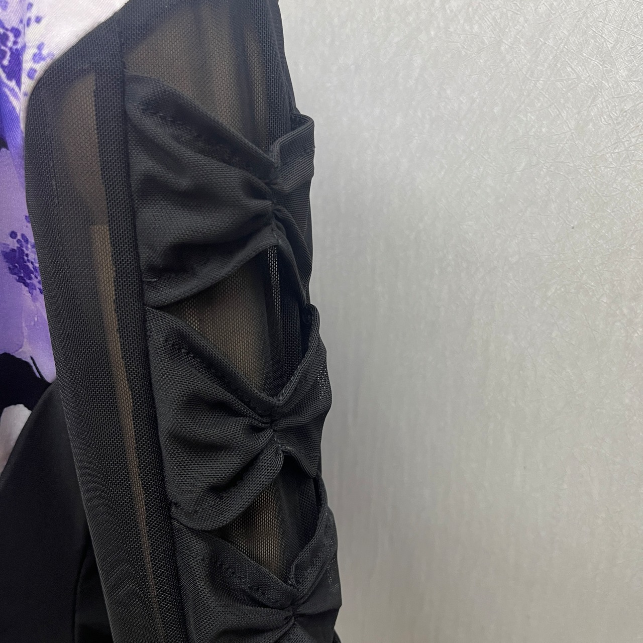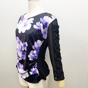 ツルッとした上質のストレッチ黒地に紫の花柄トップス。