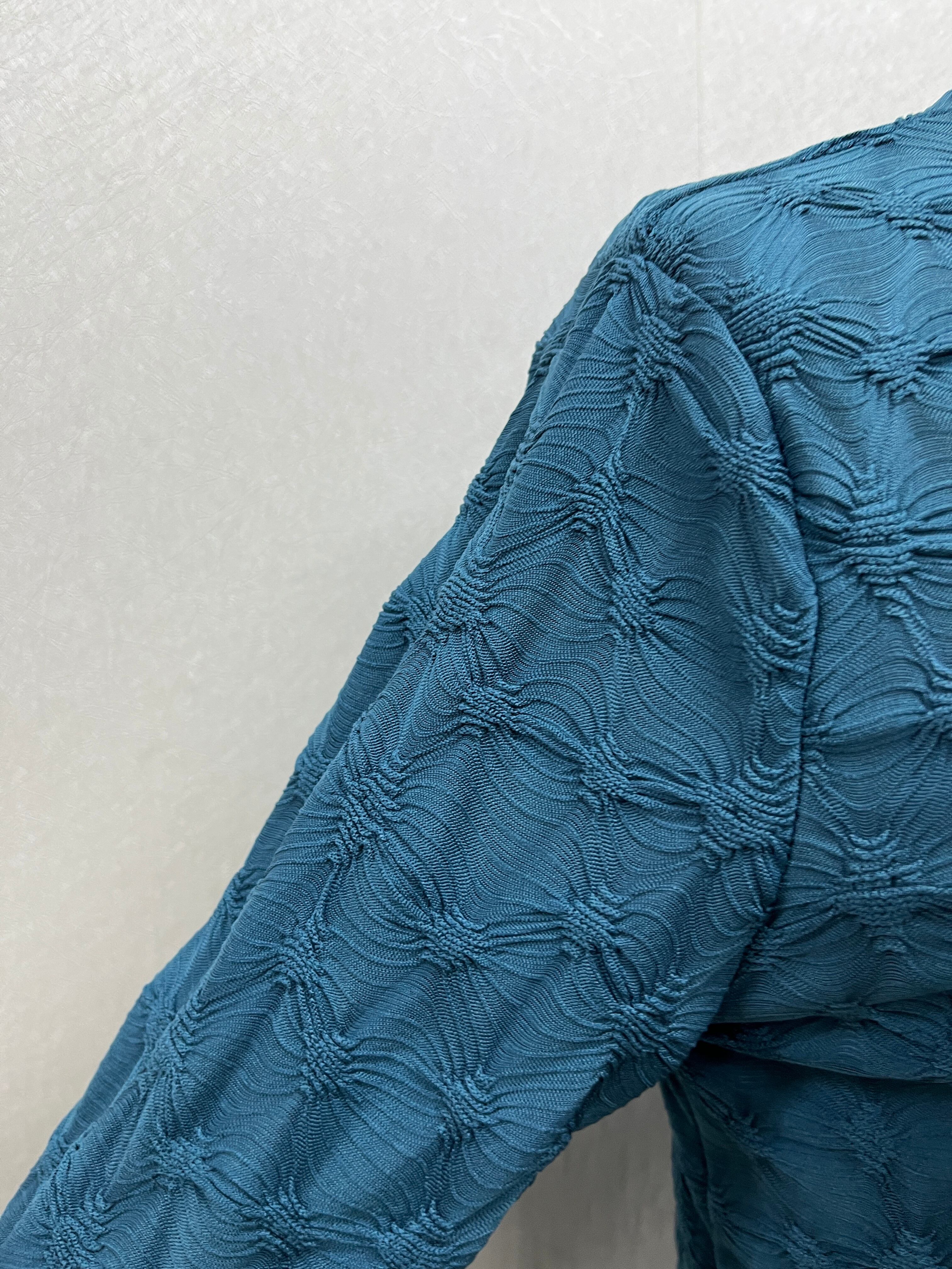 色がブルーグリーンで模様がオシャレなトップスです。よく伸びる気持ち良い素材です。